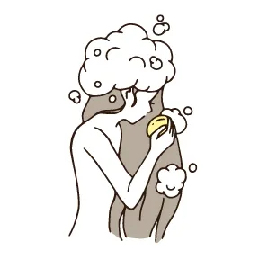 03. 頭⽪部分から指先でもちもちの泡がたつように泡⽴て、髪と頭⽪を洗います。